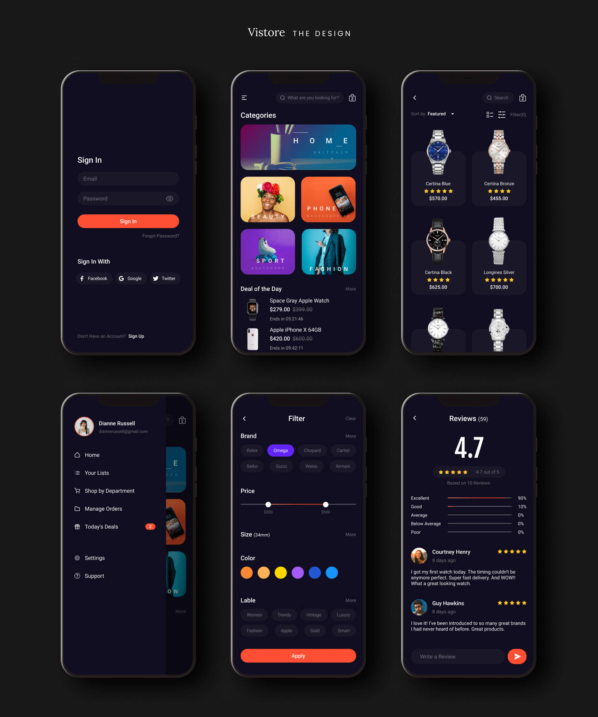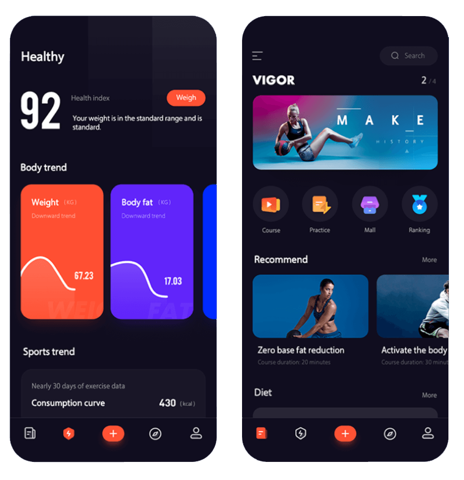 The original screens featured a dark mode design with stroke icons, rounded corners, and bold typography. The color palette includes shades of orange, blue, and purple, with orange highlighting call-to-action elements.